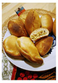 ロシアの伝統的な家庭料理であると同時に、街中のキオスク(小さな売店)などでも売られている、ロシアの人たちにとってとても馴染み深い食べ物です。 小麦粉を練った生地に色々な具材を包み、揚げたり、オーブンで焼いてつくります。生地や中身も様々で、パン生地の他にクッキー生地やパイ生地があり、中 には挽き肉やキャベツの炒め物、ご飯に刻みゆで卵、焼き魚をほぐしたもの、マッシュポテト、キノコの炒め物、甘く煮たリンゴなどや晩ご飯の残りまで…身 近にあるものを包んで楽しむのです。